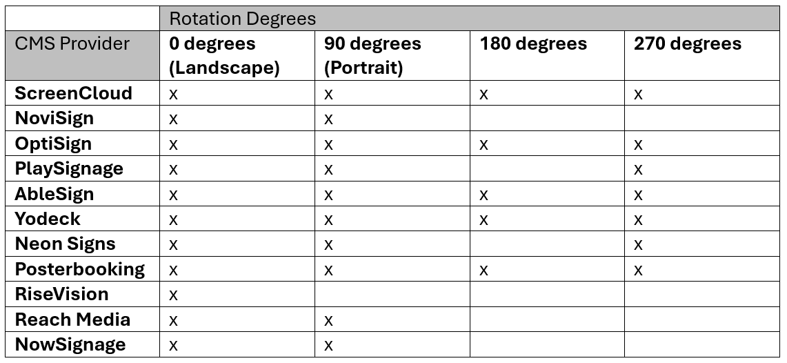 Here's a list of the CMS platforms and their supported screen orientation options:
