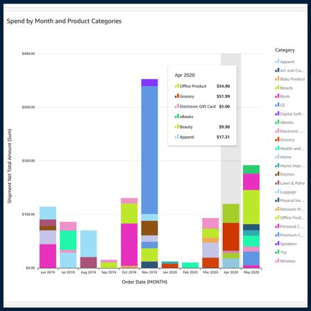 Spend Visibility, powered by Amazon QuickSight, allows you to discover purchasing insights and analyze purchasing goals. Amazon Business provides out-of-the-box dashboards to help you get started quickly.