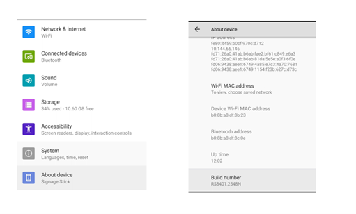 Using either the virtual remote or the physical remote, open settings by pressing the gear icon and then navigate to "About Device" >>> "Build number."